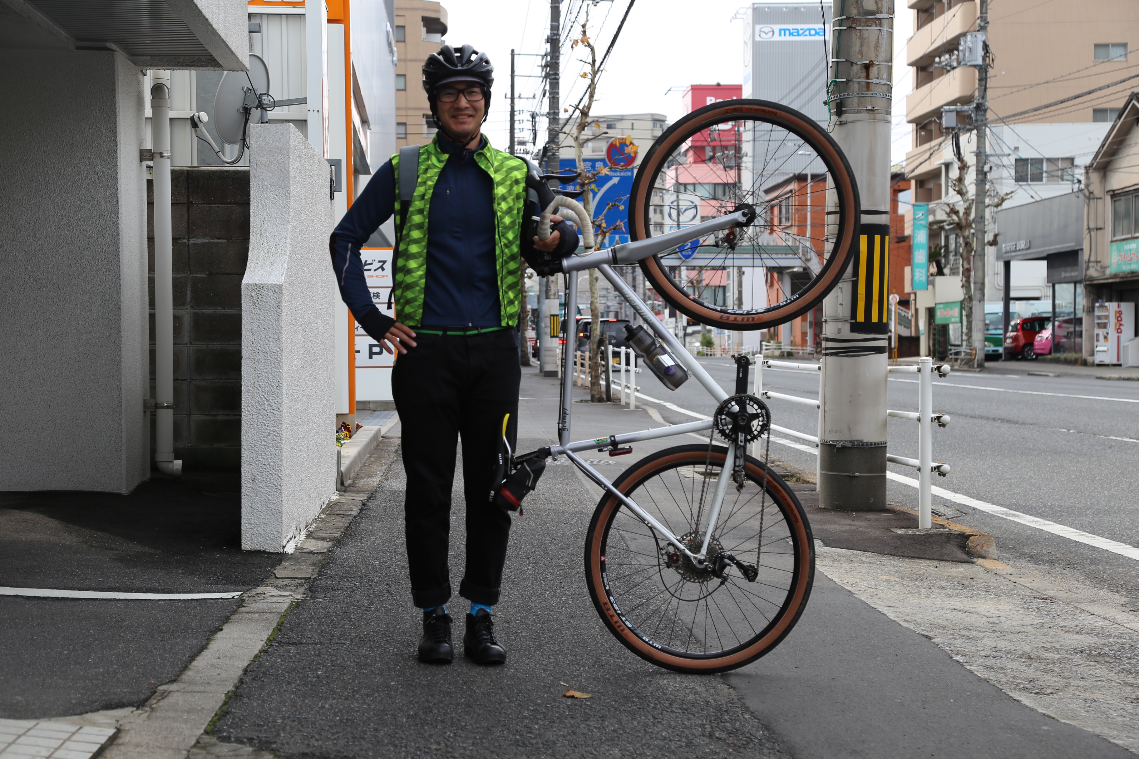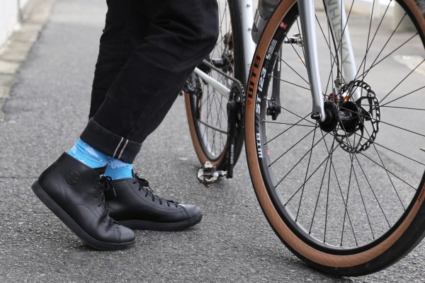 今日の榎ピー、今季のカフェドゥシクリステのジャージーとベストでキメております。足元はクォクハムのシンプルで大人っぽいシューズです。もちろんSPD対応のシューズですが、とてもスマートな印象。ディーパーズウェアのハイキックジーンズとバックパックで、コテコテのサイクルジャージっぽくせずにカジュアルさを残してます。