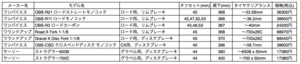 フォーク無しを選択できるモデル名と価格です。これ以外のモデルや完成車には対応しません。