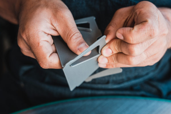 TOAKSのCS-02ソロセットに同梱されているウィンドスクリーンは、幅が広めに設定されています。こちらを2cm程度カットすれば、ポットの中にスッキリと治るようになります。